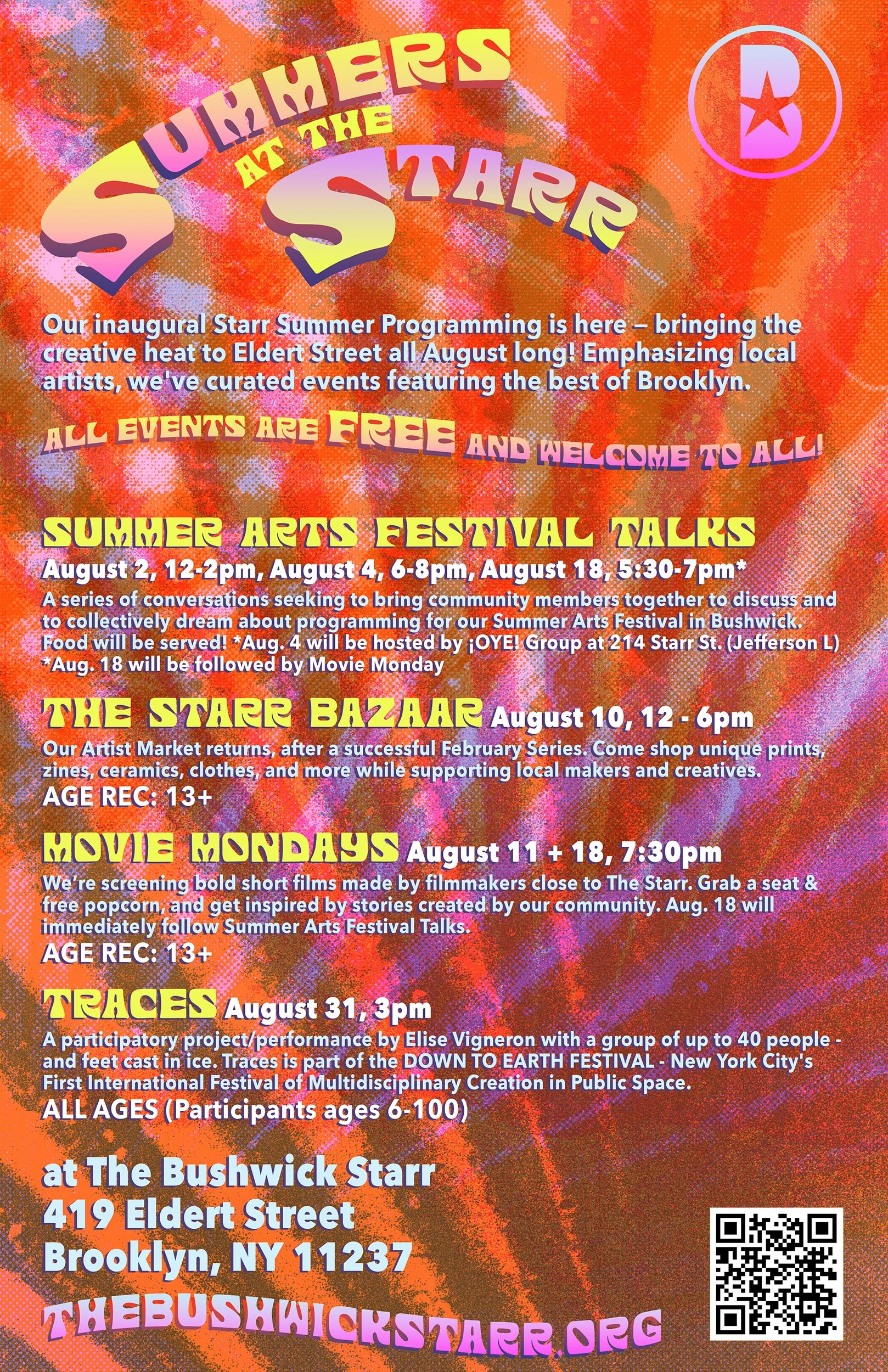 We warmly invite Bushwick Community Members to The Bushwick Starr's Summer Arts Festival Talks series, as part of our Summers at the Starr programming. This series seeks to bring community members together to discuss and to collectively dream about programming for the Summer Arts Festival, which the Starr has traditionally hosted in collaboration with Bushwick-based arts/performance organization ¡OYE! Group. This summer, we decided to pause the festival to hear from our community members about how it can be refreshed & envisioned for the future!